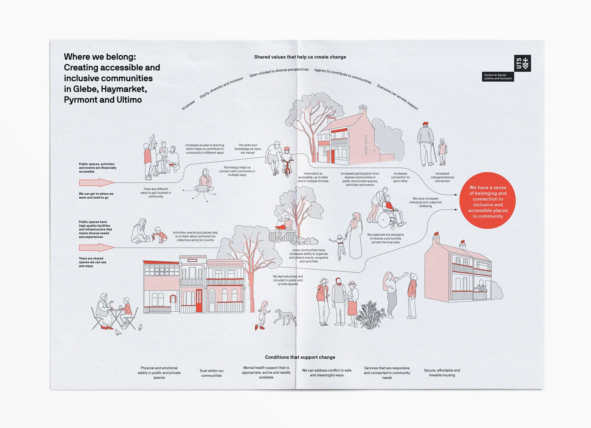 Erin partnered with the University of Technology Sydney’s Centre for Social Justice and Inclusion to develop a visualisation of a community-led research project articulating the key elements that contribute to building accessible and inclusive communities in the unique inner Sydney areas of Glebe, Ultimo, Pyrmont, and Haymarket. The primary goal was to create a visual roadmap that not only conveyed important information but also captured the distinct character and feel of these neighbourhoods.