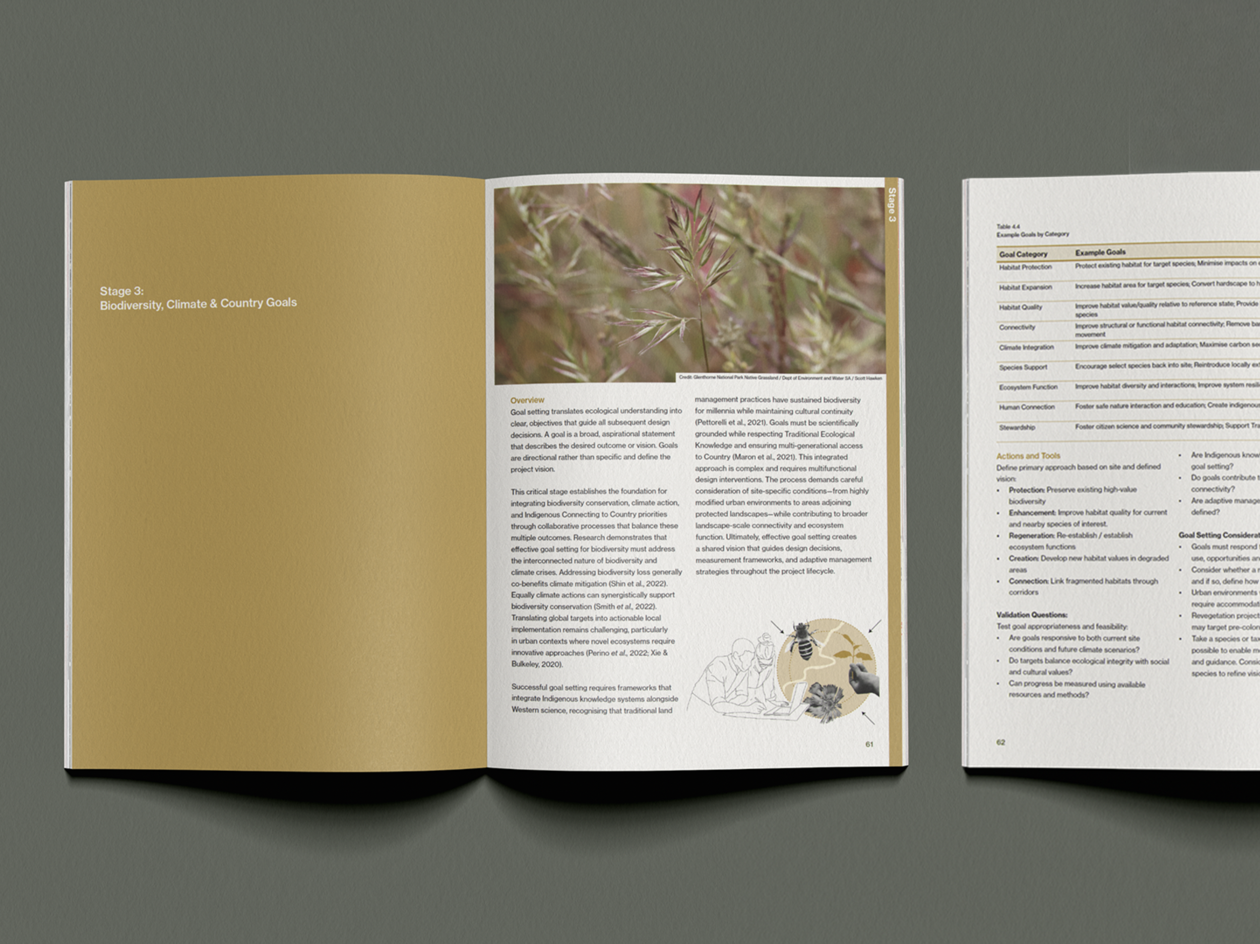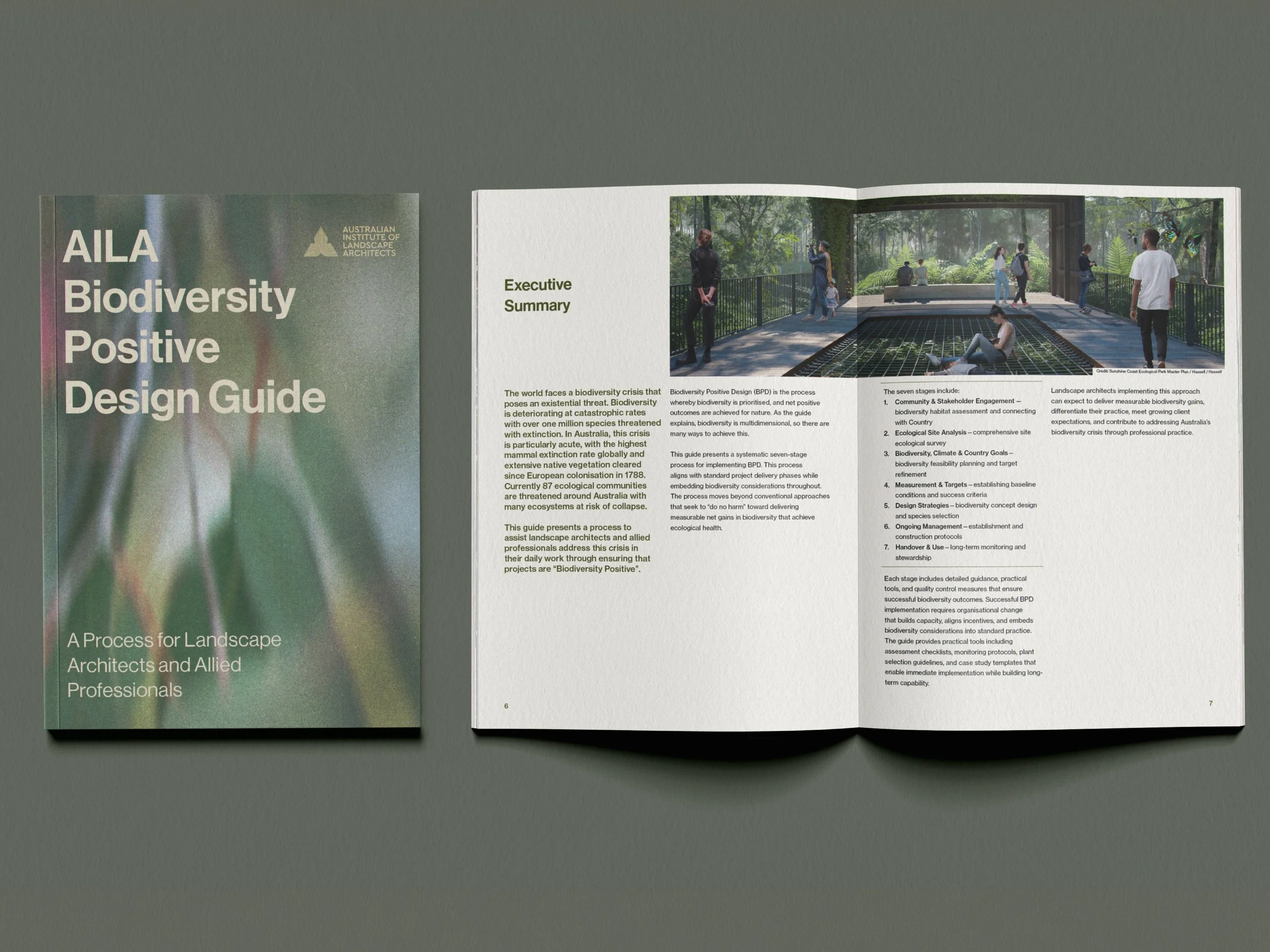 Erin was commissioned by the Australian Institute of Landscape Architects to develop a visual strategy for their Biodiversity Positive Design Guide. This 120-page professional practice guide outlines a seven-stage process for embedding biodiversity outcomes into landscape architecture.