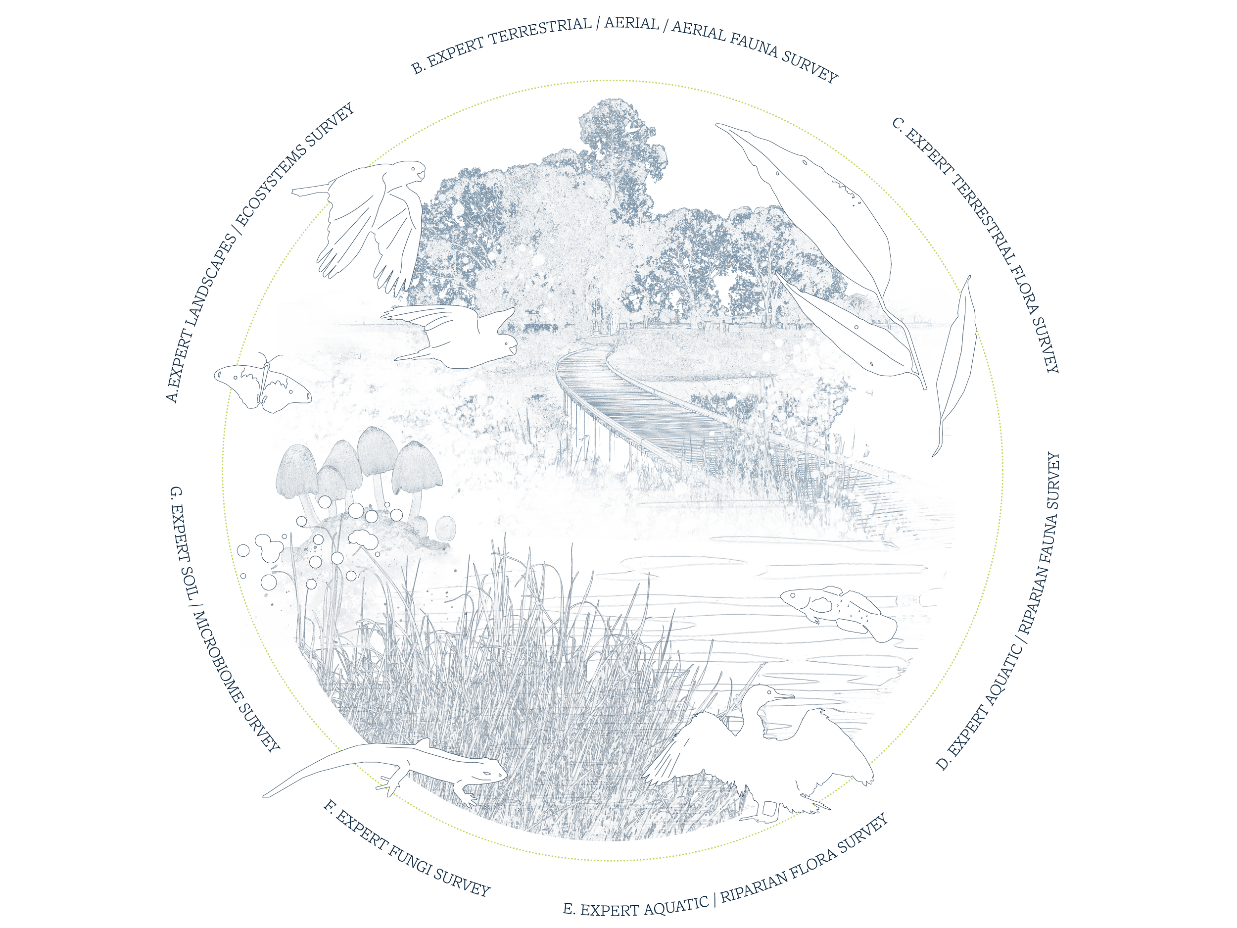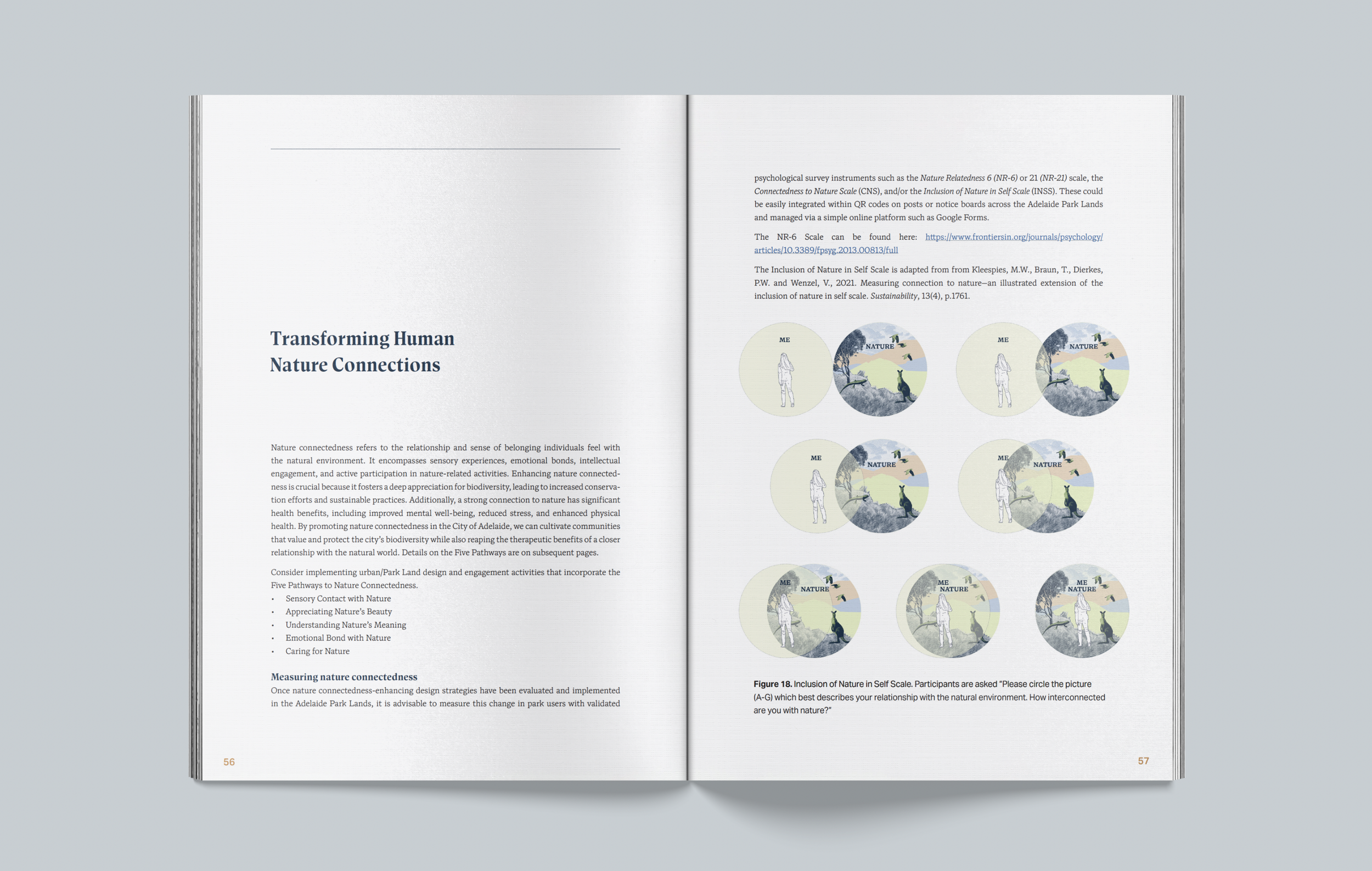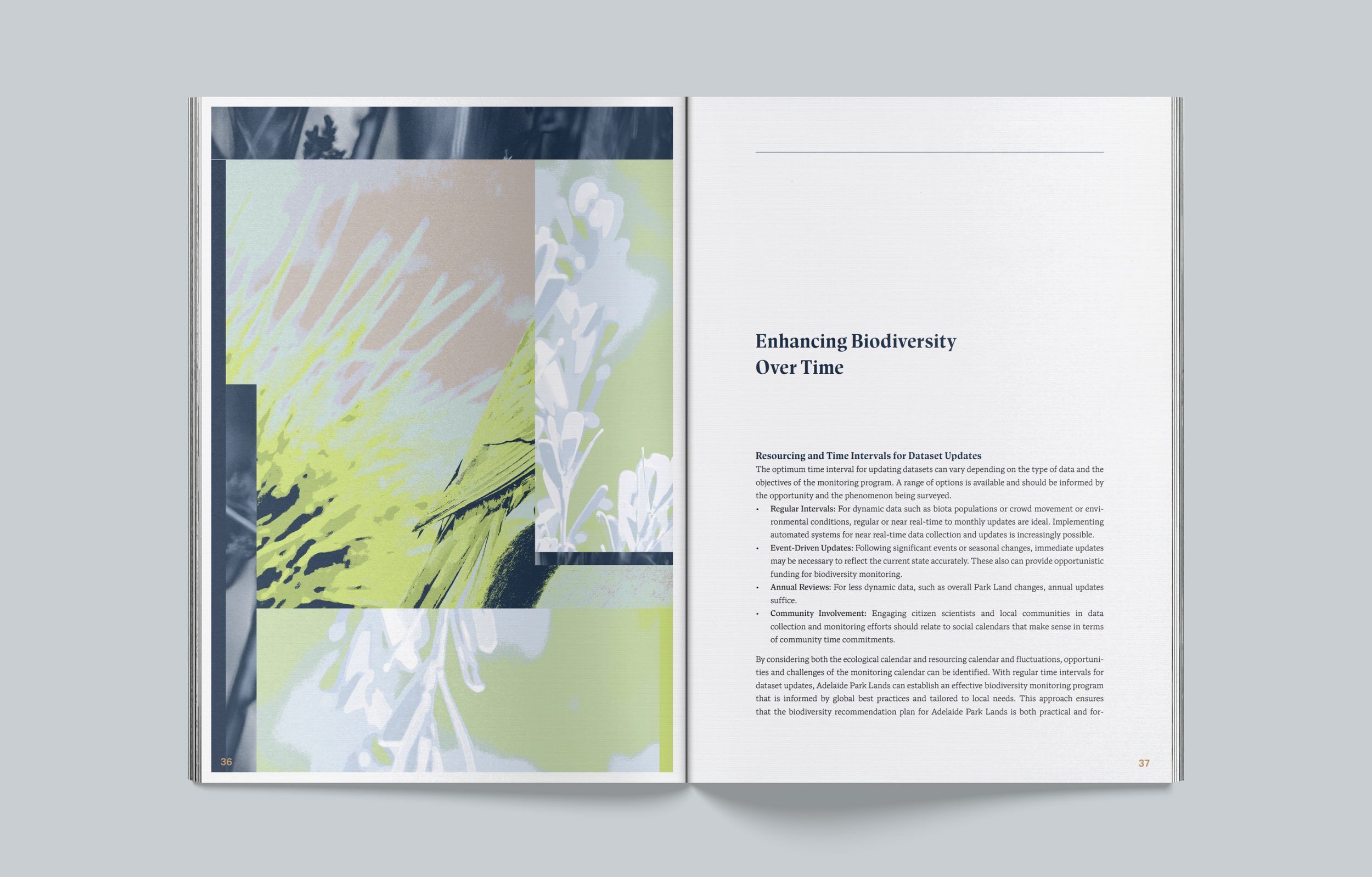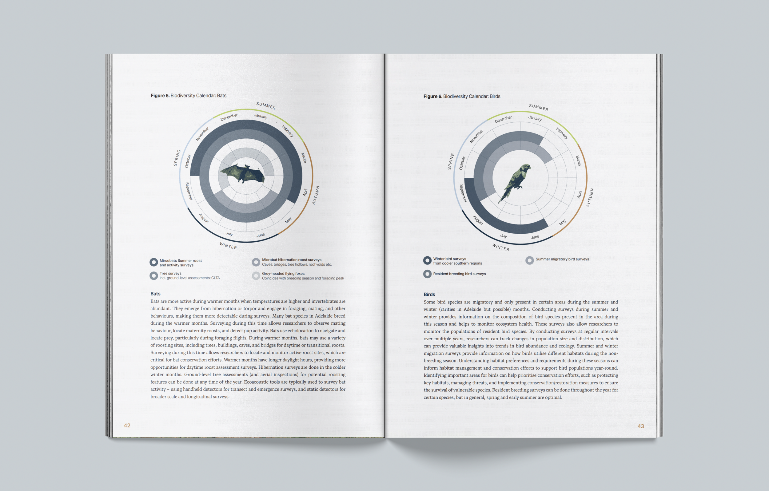 The designs developed for this project needed to balance the requirements of an academic report while also being engaging to a broader public audience. With this in mind, many of the visualisations were designed using a visual narrative approach which emphasised the rich, layered nature of the Adelaide Park Lands and its biodiversity.