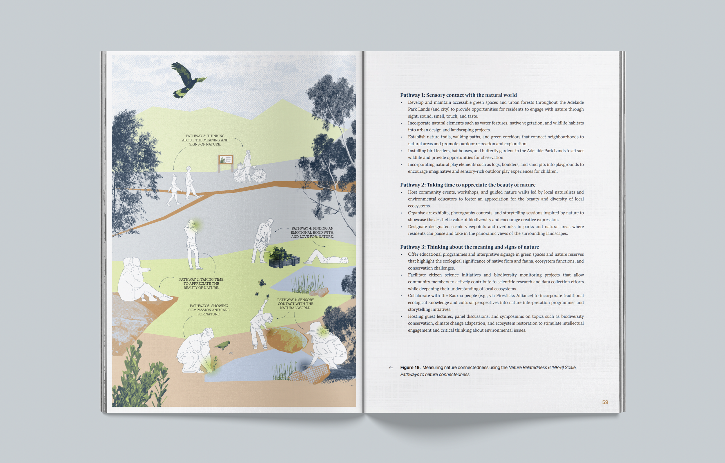 “Erin's work on our Adelaide Biodiversity Reports was transformative. She translated dense ecological data into visually compelling stories that engaged readers—no small feat for a government document of two volumes. Her collaborative process kept our scientific team involved while she pushed creative boundaries … Her fluency in both contemporary design trends and science communication brought fresh approaches that elevated our reports and made them come alive”. — A/Prof Scott Hawken, Director of Landscape Architecture and Urban Design, University of Adelaide
