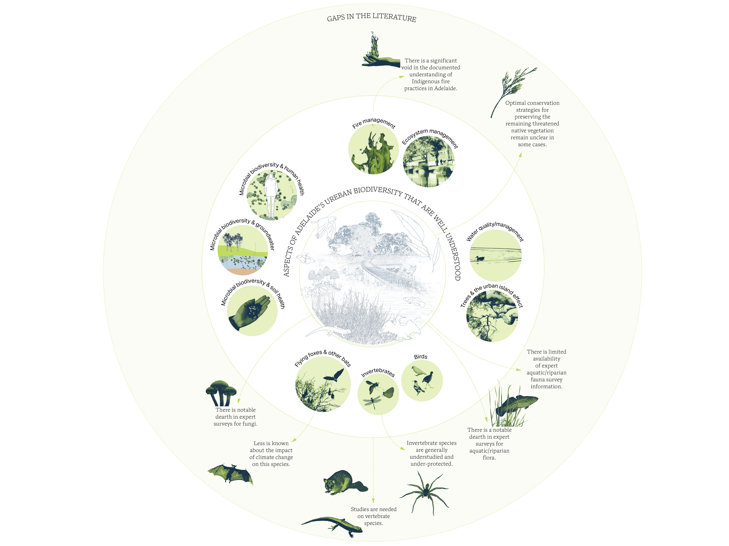 Working in collaboration with academics from the University of Adelaide Green Urban Futures Research Group, Erin was commissioned to visualise concepts and data related to the biodiversity and conservation of the Adelaide Park Lands. Produced for the City of Adelaide, the project involved the development of a suite of visualisations and the design of two reports and associated visuals. The visualisations developed range from maps, graphic representations of research processes to rich visual explorations of biodiversity concepts.