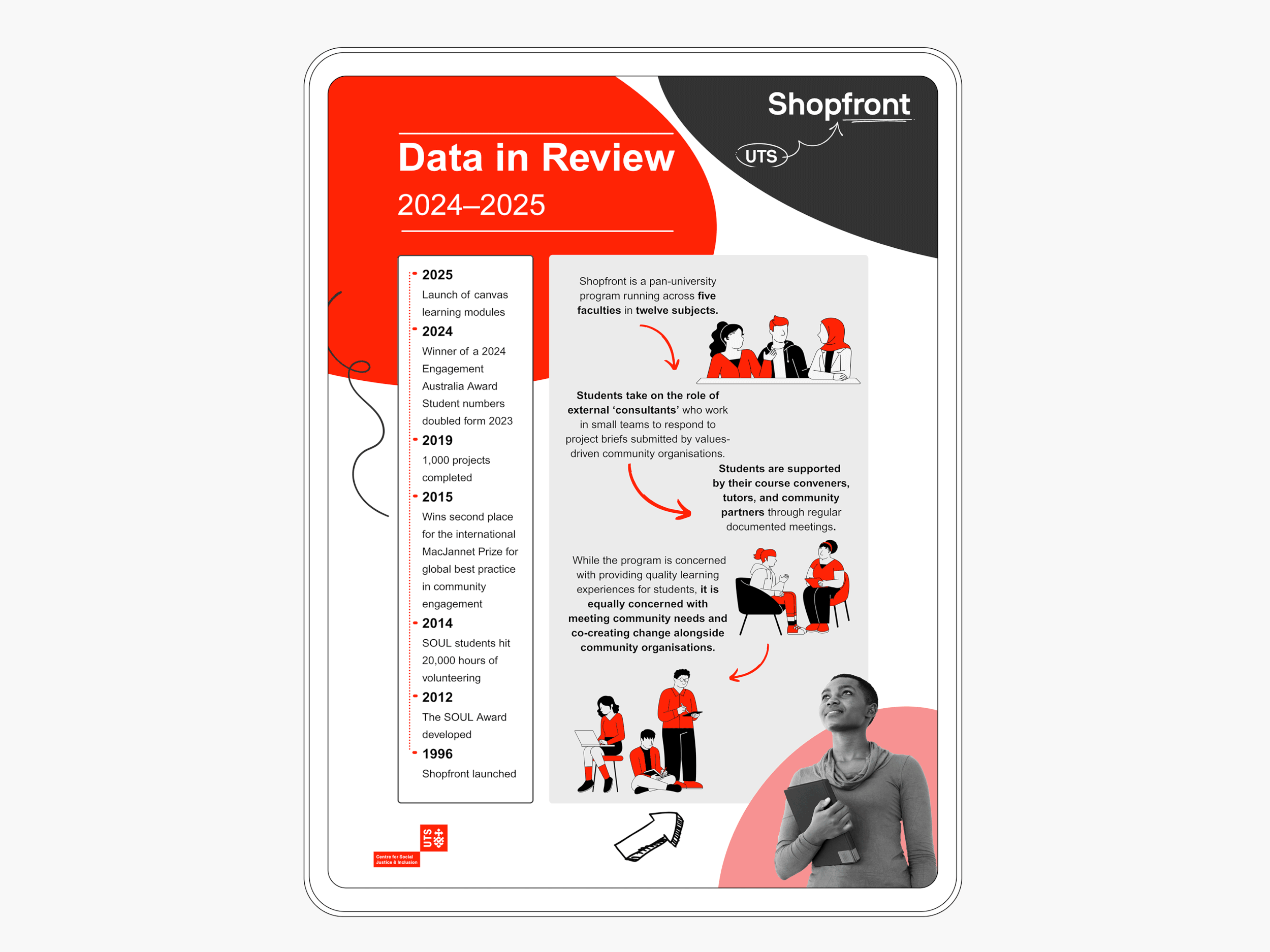 UTS engaged Erin to develop a set of four infographic templates that staff could easily update without specialist software or design skills. The goal was to create a practical toolkit that amplified communication for the Centre for Social Justice and Inclusion while remaining fully aligned with the UTS brand.